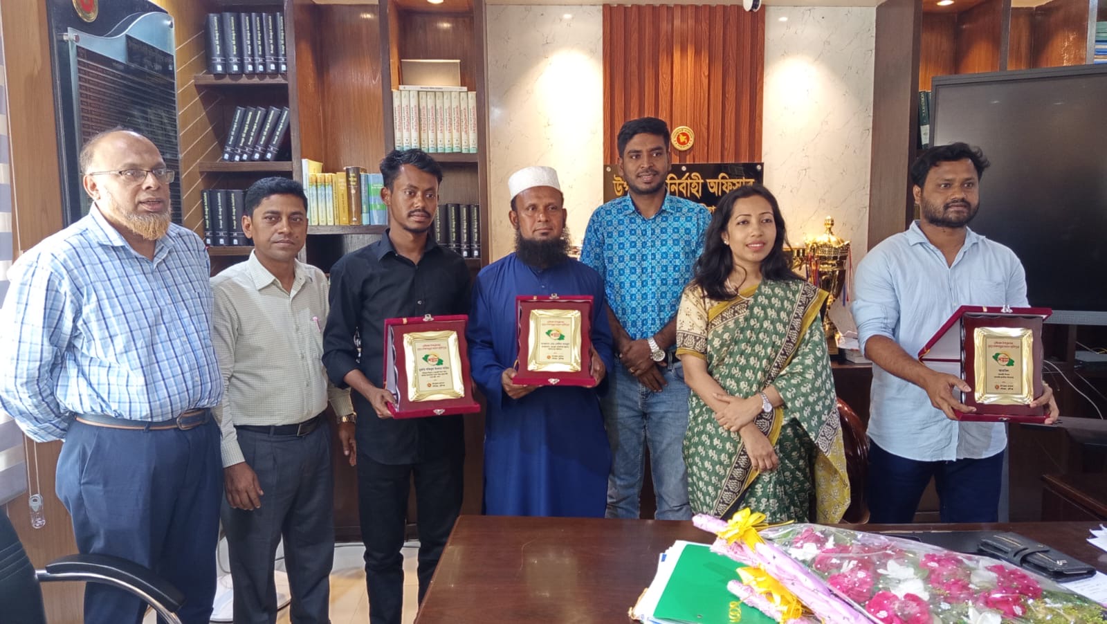 এ সময় সম্মাননা স্মারক তুলে দেন উপজেলা নির্বাহী কর্মকর্তা ফারজানা ববি মিতু, উপজেলা প্রাণিসম্পদ কর্মকর্তা ডা. শ্যামল চন্দ্র পোদ্দার, উপজেলা প্রকৌশলী মো. রেজাউল ইসলাম এবং সমাজসেবা কর্মকর্তা উজ্জ্বল মুন্সি প্রমুখ।