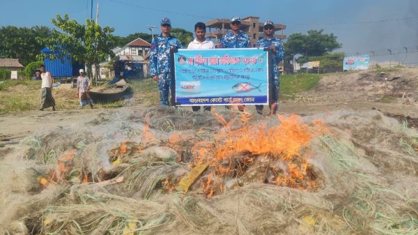পদ্মা নদীতে টানা ২২ দিনের অভিযান: লৌহজংয়ে কারেন্ট জালের আগুনে অভিযান সফল